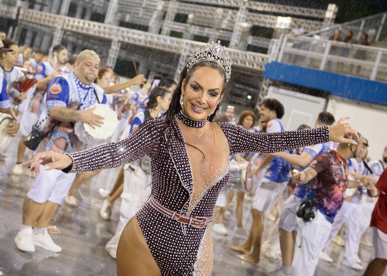 Mas a chuva não tirou o brilho e a beleza da produção escolhida pela rainha Camila Prins: um macacão transparente e bordado com mais de 10 mil cristais, assinado pelos estilistas do Espaço Luz Ateliê e maquiagem do artista Bruno Fatone.